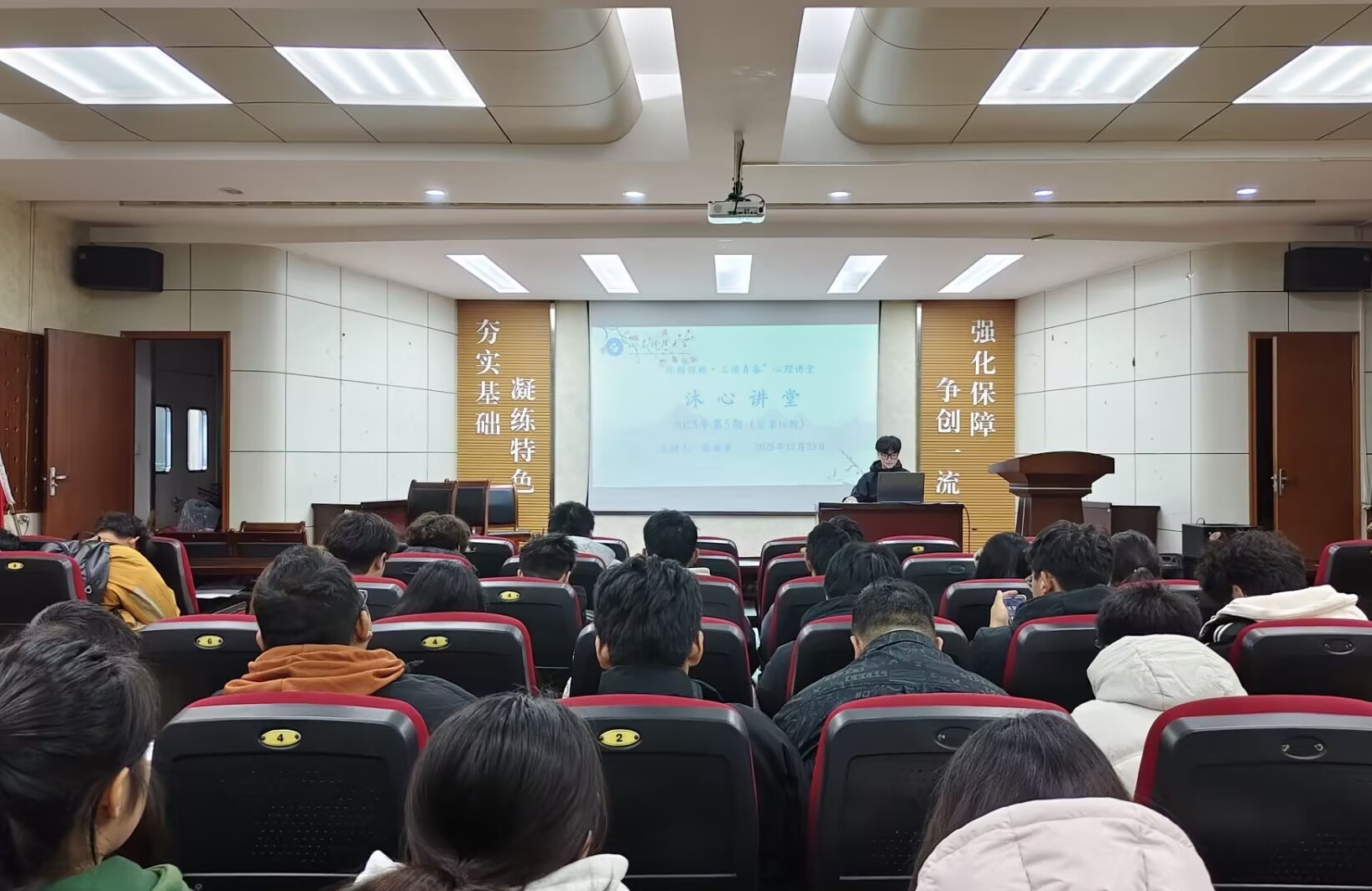 第十六期沐心心理讲堂在J2-104报告厅举行。本期讲堂以“解锁幸福的科学解码——积极心理学”为主题,由学院心理健康联合会副会长张益豪主讲,心健联全体成员参加。