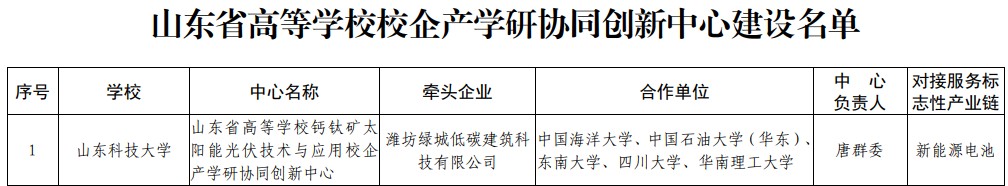 近日,山东省教育厅、山东省工业和信息化厅公布了山东省高等学校校企产学研协同创新中心建设名单,由我院唐群委教授担任中心负责人的山东省高等学校钙钛矿太阳能光伏技术与应用校企产学研协同创新中心获批成立。