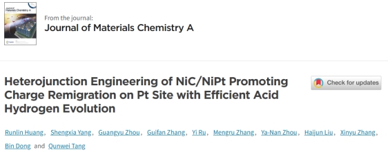 2023级化学工程与工艺专业本科生黄润林以独立第一作者在材料和化学领域著名期刊Journal of Materials Chemistry A(JCR一区TOP期刊,IF=10.7)2026 Emerging Investigators themed issue发表题为《Heterojunction Engineering of NiC/NiPt Promoting Charge Remigration on Pt Site with Efficient Acid Hydrogen Evolution》的研究论文,该研究的指导教师是张鑫宇学术教授。