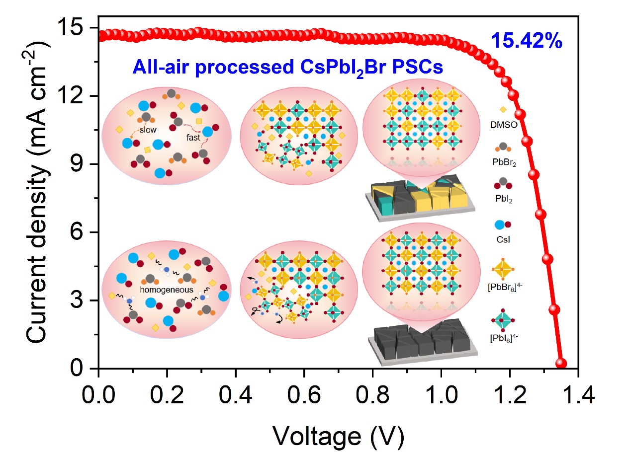 宽禁带混合卤化物钙钛矿是制备高性能叠层钙钛矿太阳能电池的关键材料,然而在钙钛矿结晶过程中卤化铅(PbX2)与溶剂分子间存在的配位能力差异,易导致卤素分布不均、相分离严重,进而影响器件效率与稳定性。针对这一挑战,研究团队通过在常用溶剂DMSO中引入水分子,精准调控溶剂的介电常数与Gutmann给体数,从而平衡DMSO与PbI2、PbBr2的相互作用能,实现了两种卤化铅的同步结晶。得益于结晶动力学的优化,全空气中制备的碳基全无机CsPbI2Br器件效率提升至15.42%。此外,研究团队提出采用疏水溶剂封装策略精确控制水分含量,有效提升了器件在空气中的制备重复性与储存稳定性。该研究为调控混合卤化物钙钛矿结晶行为提供了新思路,也为实现高效、稳定的叠层光伏器件奠定了重要基础。